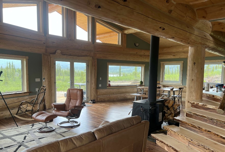 The great room has a vaulted ceiling with large picture windows throughout allowing guests to view the wildlife coming down to the lake and the amazing views of the Alaska Range and Clearwater Mountains.